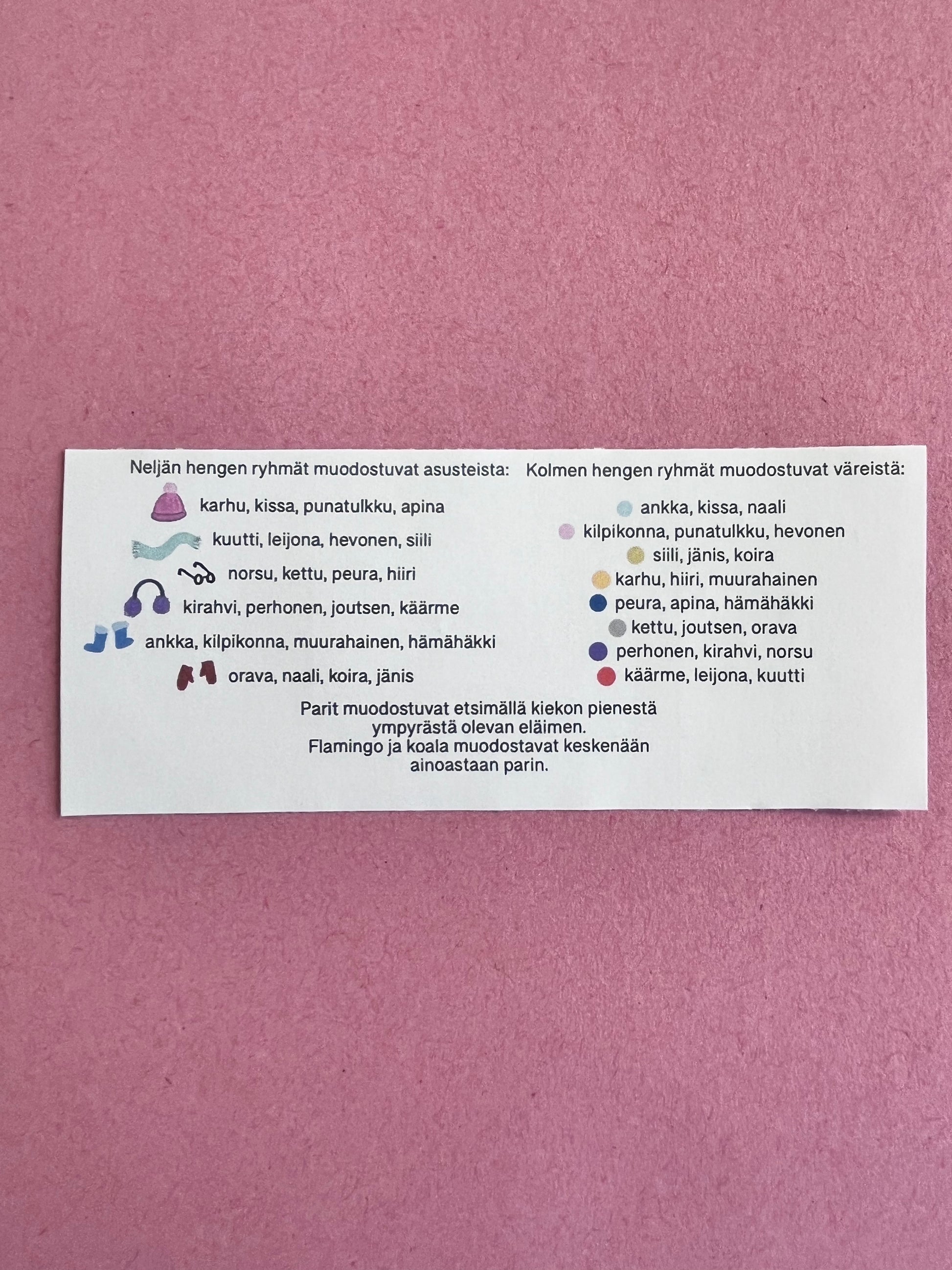 - Neljän hengen ryhmät muodostuvat kiekkojen eläinten asusteiden mukaan.